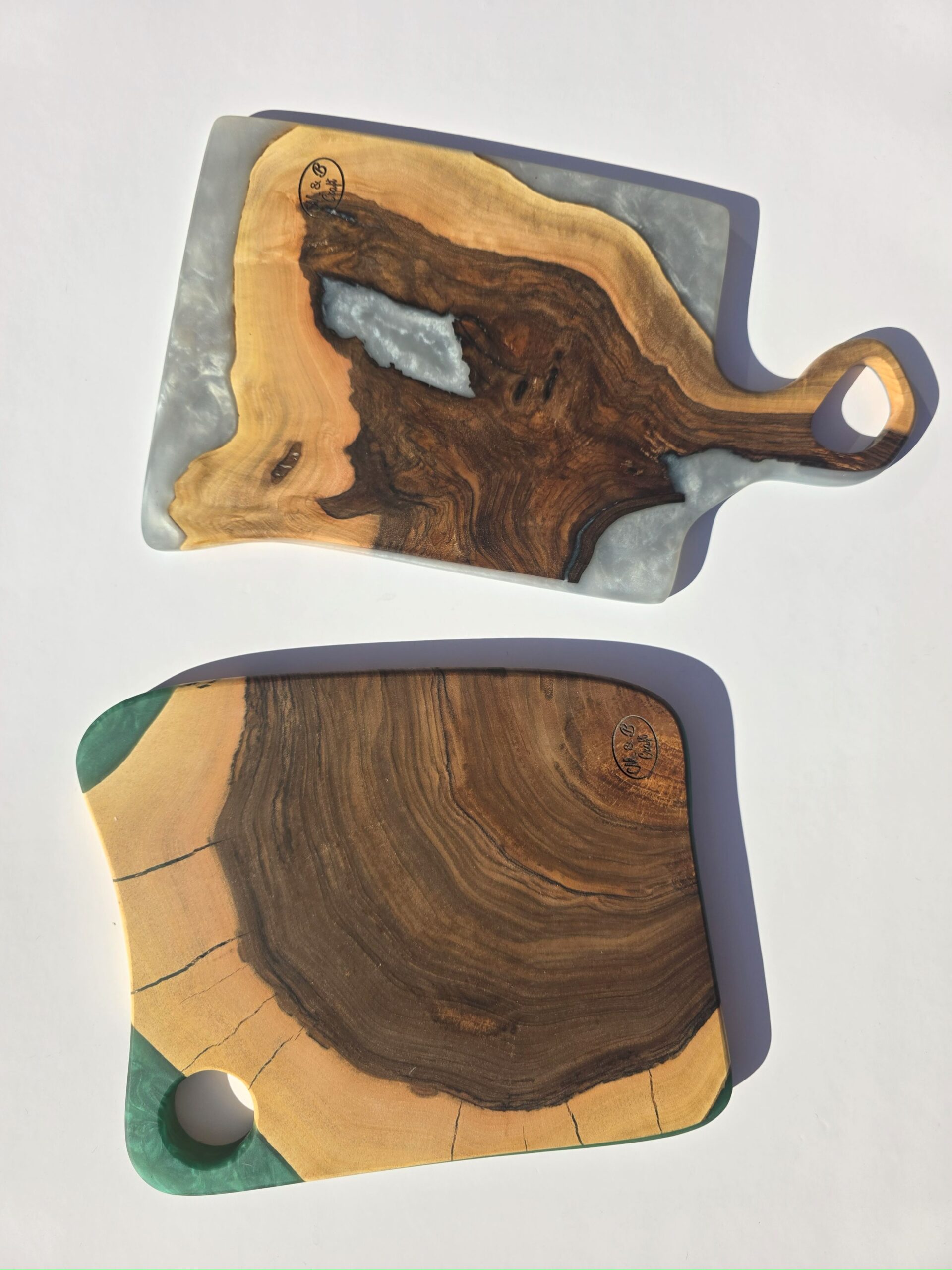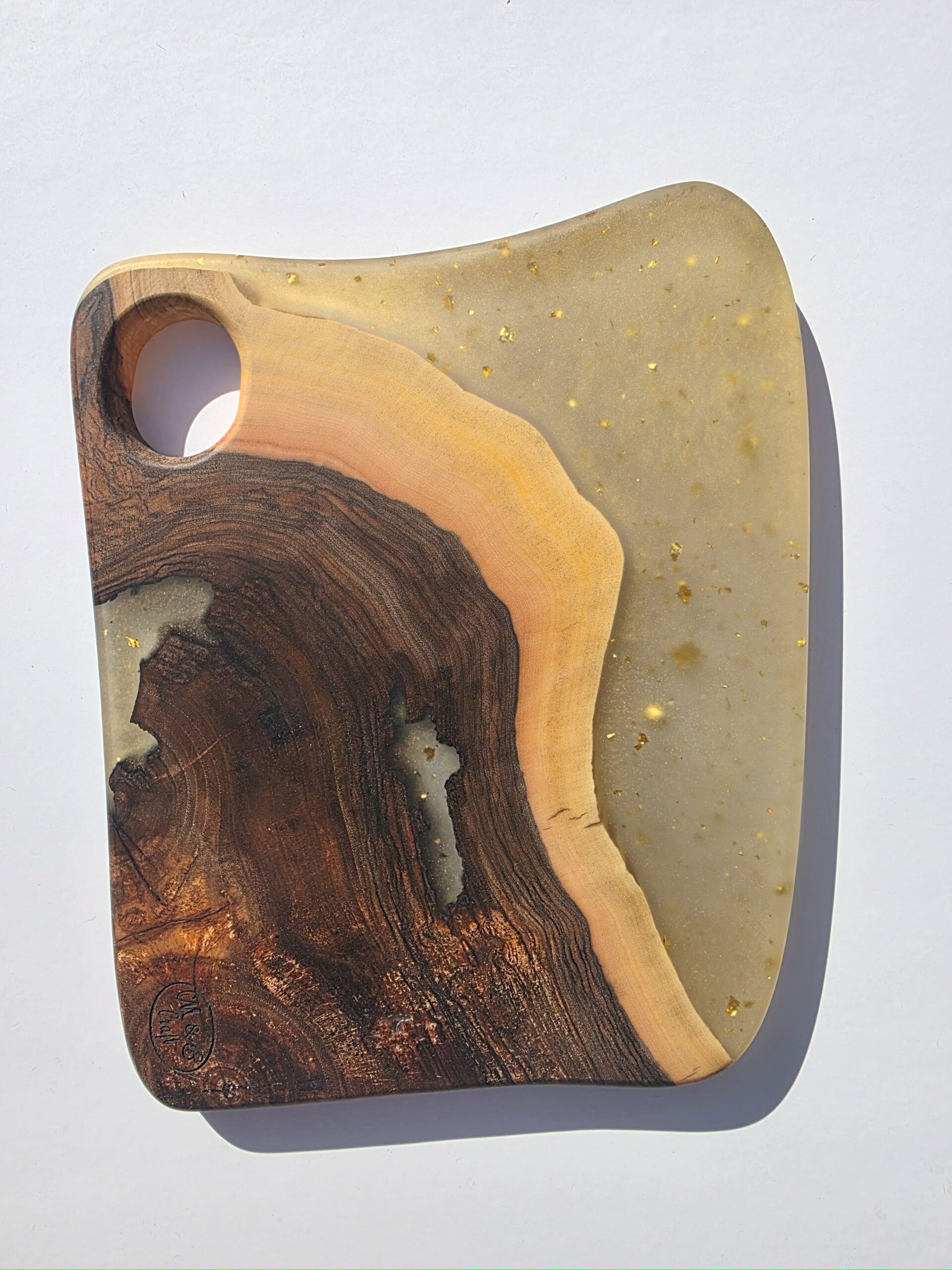 Add a touch of natural elegance to your home with this handcrafted serving tray, expertly made from premium black walnut wood. This resin serving tray features a stunning combination of high-quality epoxy resin, infused with white pearl accents and vibrant golden and green resin pigments, creating a captivating and luxurious visual effect.