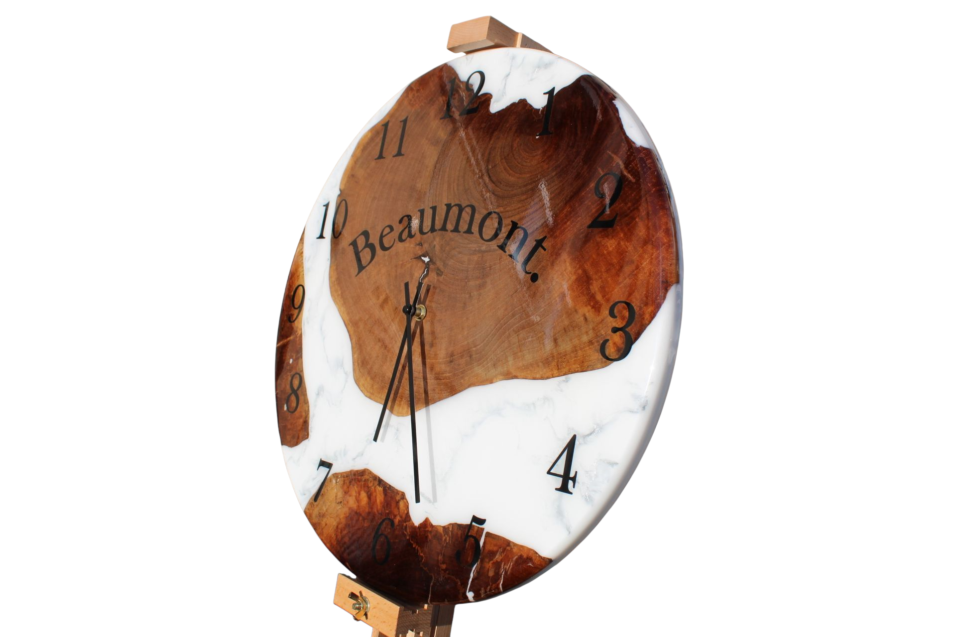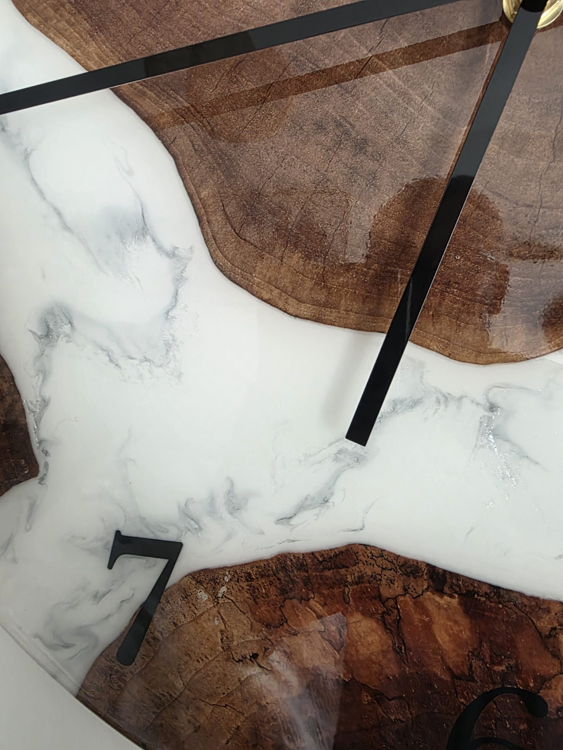 Discover the perfect statement piece for your modern home with this eye-catching resin and wood wall clock. Designed to be both functional art and a time-telling piece, this clock showcases a dramatic juxtaposition of a dark, live-edge walnut wood slab and a pristine white epoxy resin. The clean lines and bold contrast make it a focal point in any room, from a chic living room to a minimalist office.