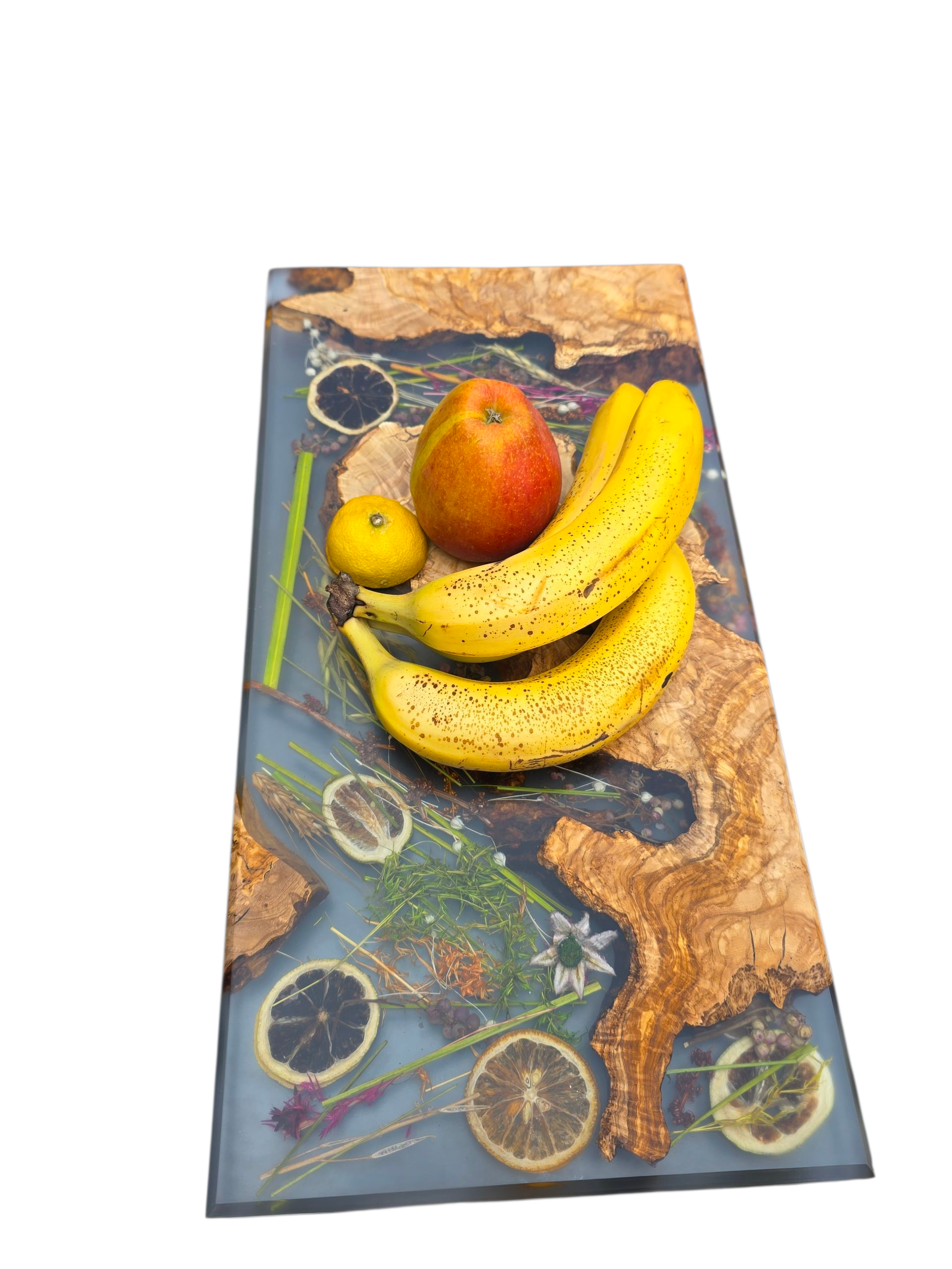 Elevate your home decor and entertaining with this stunning, handcrafted epoxy resin serving board, a true piece of functional art! This unique board combines the rustic beauty of natural olive wood with the mesmerising clarity of epoxy resin, creating a captivating “ocean map” effect.