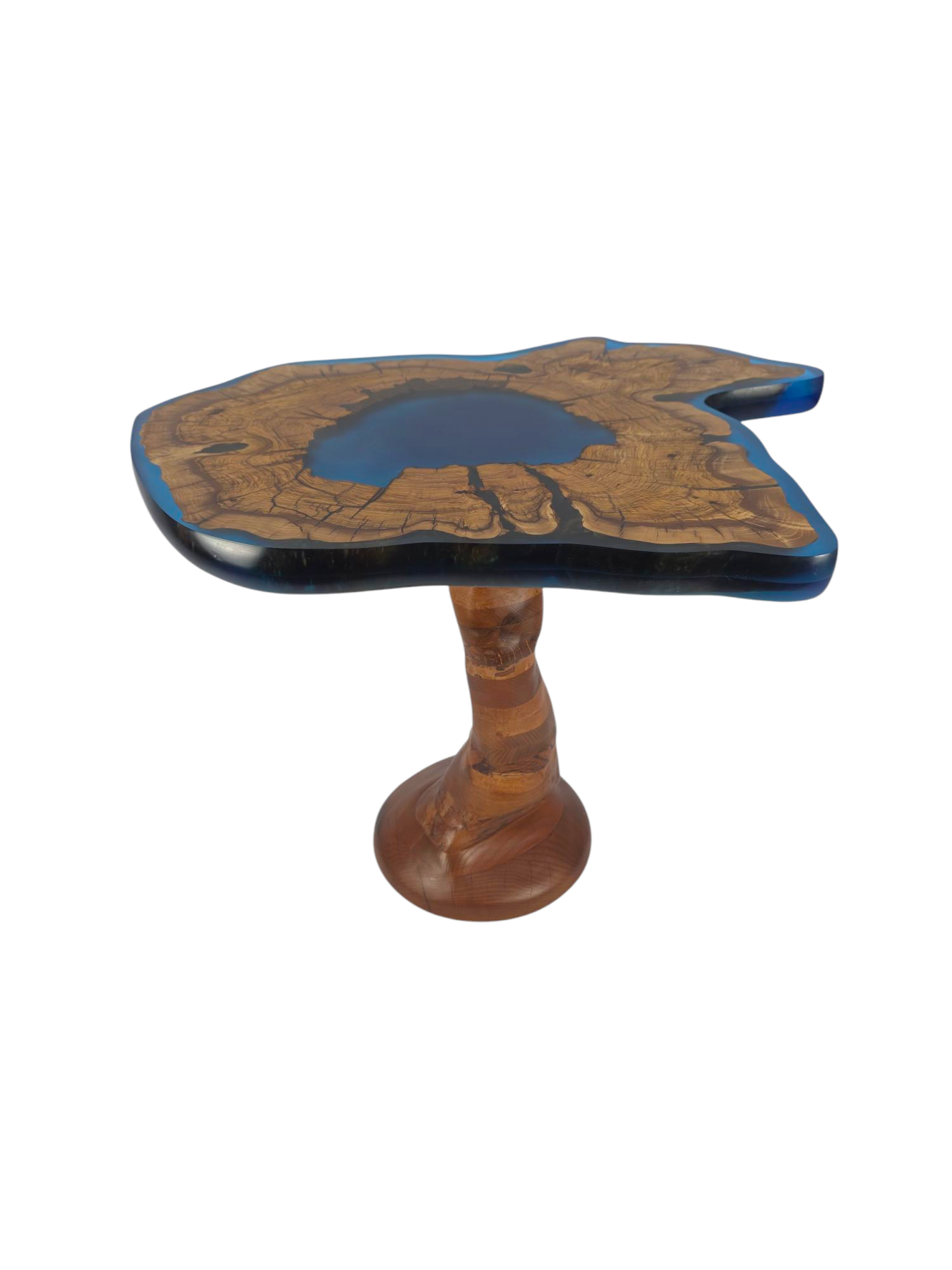 This Laguna wood resin table has a unique look. The tabletop is the most striking feature. It is made from a fantastic slice of wood with interesting grain patterns, encased in a clear, blue-tinted resin. The resin creates a smooth, glossy surface and highlights the natural texture of the wood. The blue tint gives the impression of a small, tranquil lake or pool within the wood.