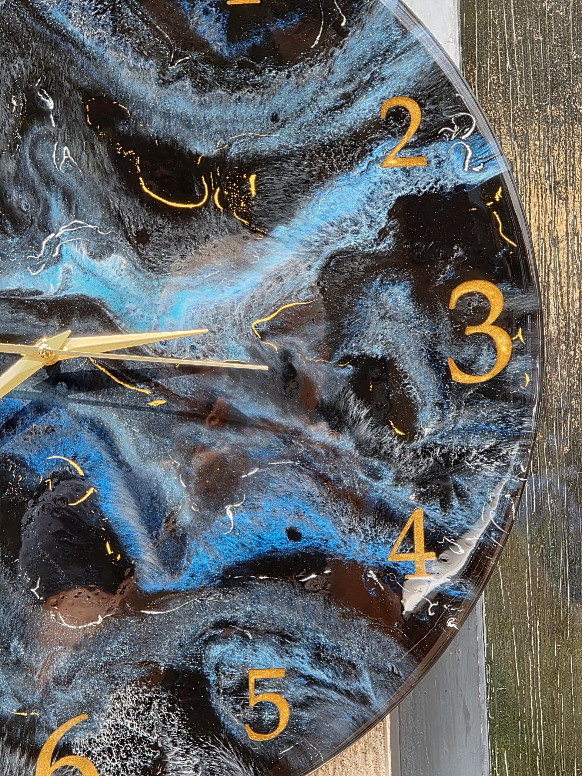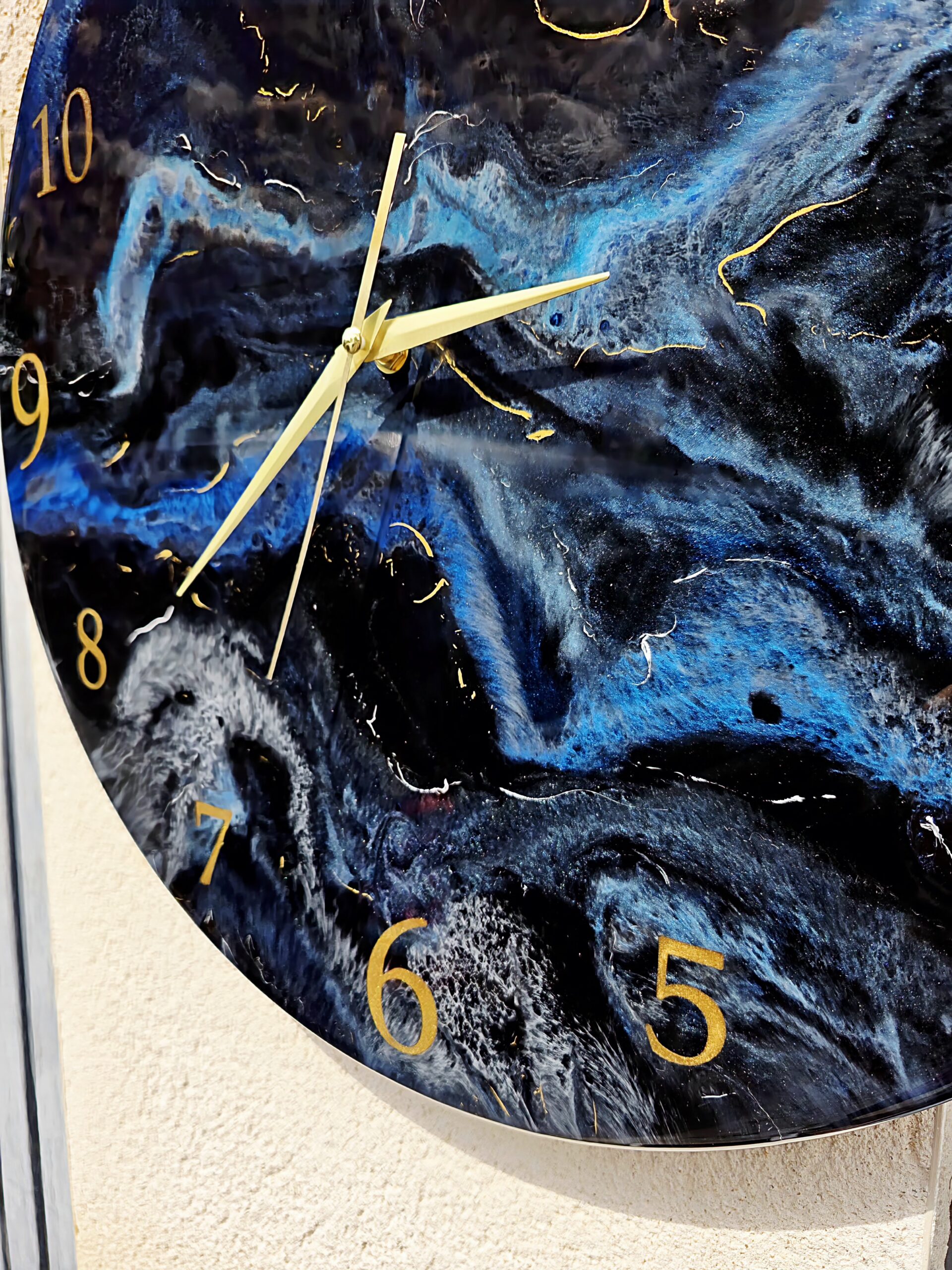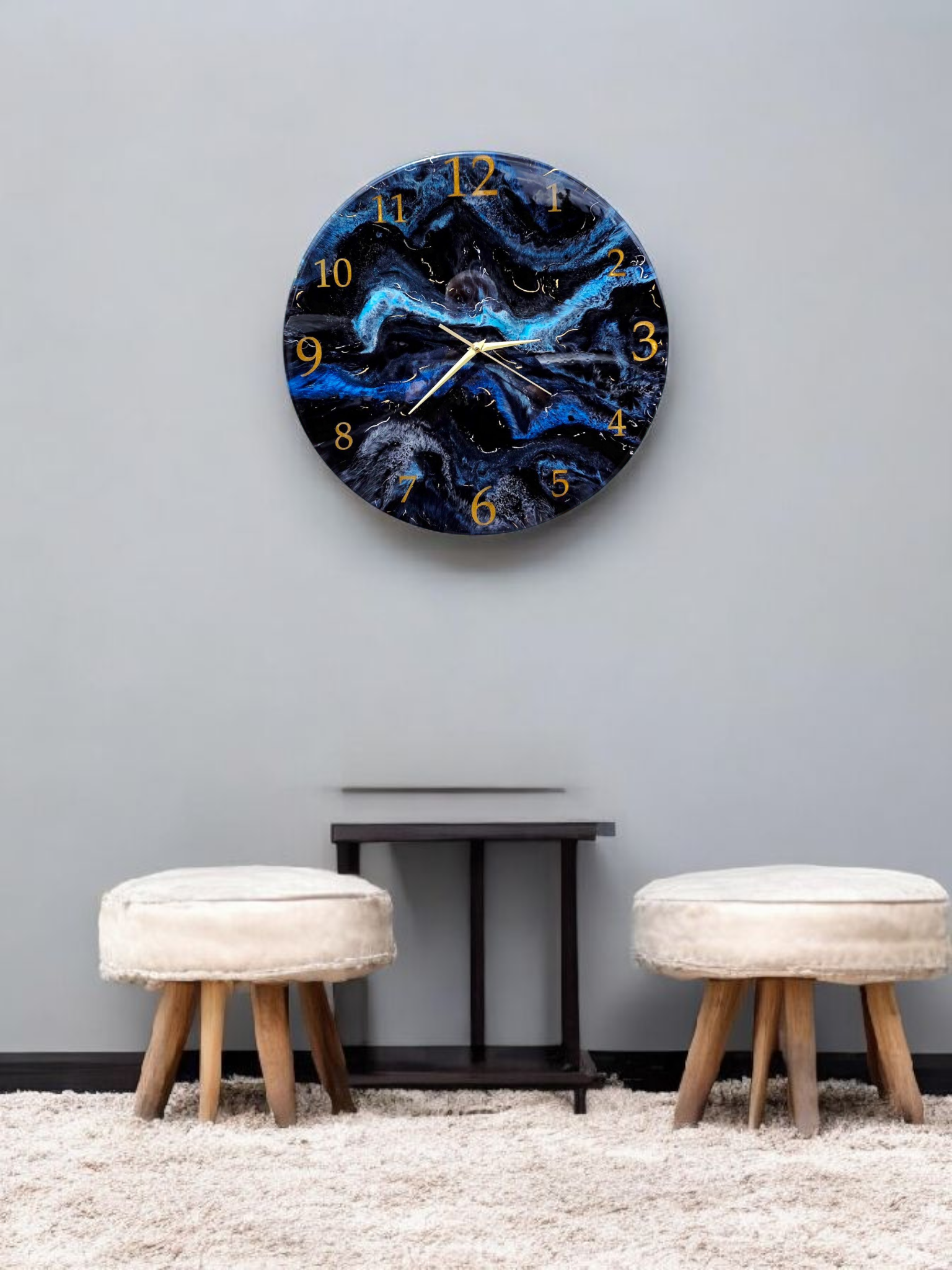 Transform your space with this stunning resin wall clock in ocean blue and gold abstract art — a perfect blend of modern design and functional elegance. Handcrafted with care, this **20-inch round clock** features a mesmerising abstract pattern created with epoxy resin, showcasing rich black, vibrant blue, and shimmering gold foil accents that evoke the beauty of ocean waves and golden sunlight.